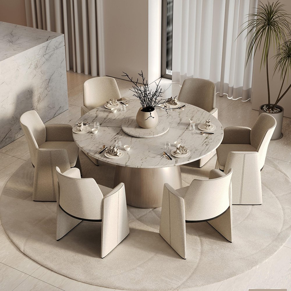 Solid wood (like oak, walnut, or ash) is a classic choice for durability, while glass, marble, and metal offer modern styles. Upholstered chairs add comfort and elegance.
